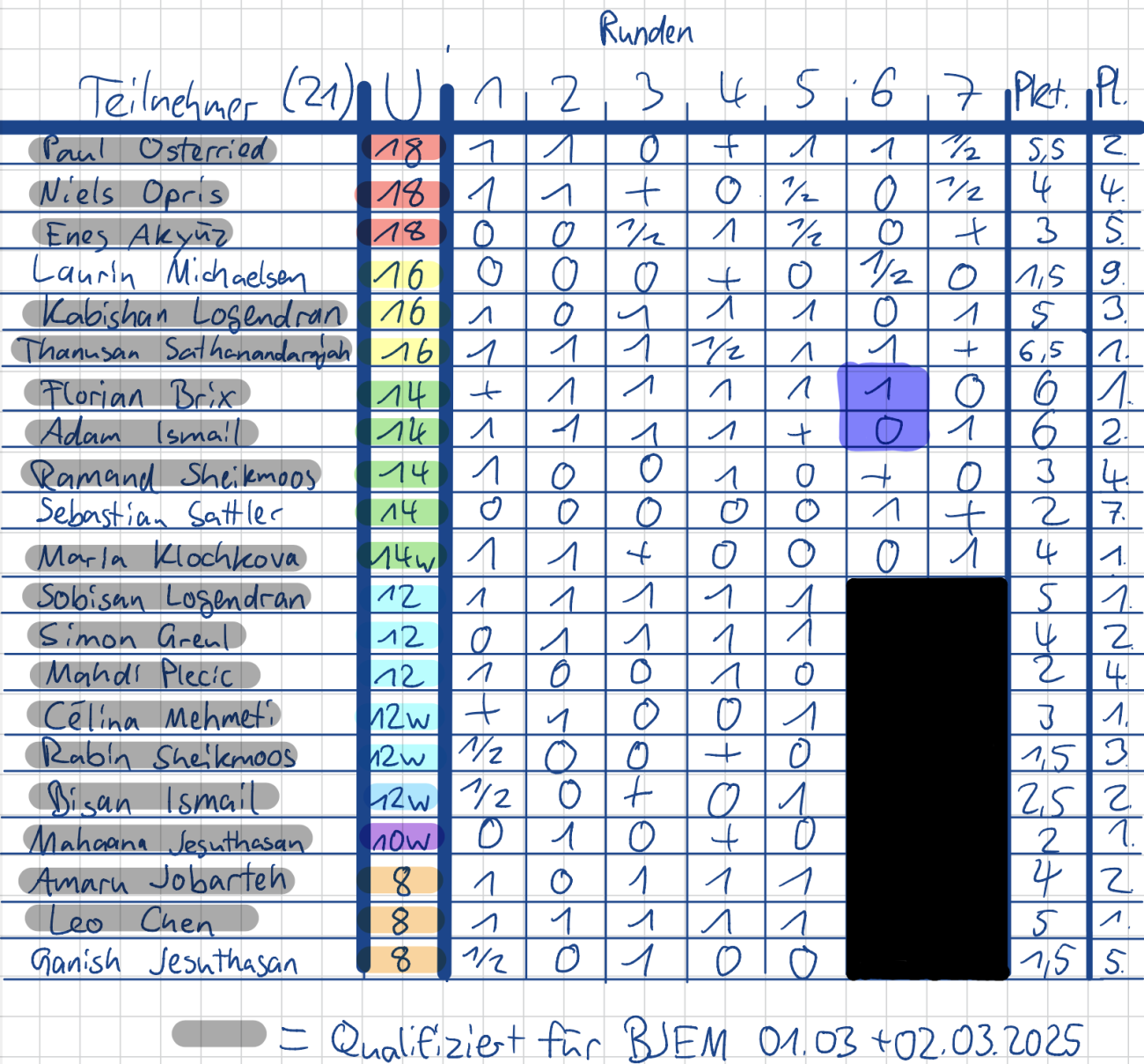 Die U14-Gruppe war hart umkämpft. Florian Brix setzte sich schließlich an die Spitze und sicherte sich den ersten Platz, dicht gefolgt von Adam Ismail, der als Zweiter abschloss. Ramand Sheikmoos belegte den vierten Platz, während Sebastian Sattler Siebter wurde. In der U14w-Kategorie triumphierte Maria Klochkova und bewies ihre Klasse mit klaren Siegen in ihren Partien.