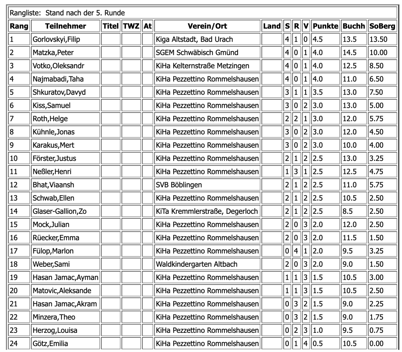 Am 22. März 2025 fand in Rommelshausen das Römer-Schnellschachturnier statt, bei dem sich zahlreiche Nachwuchsspieler aus dem Schachbezirk Stuttgart miteinander maßen. Besonders beeindruckend war der Auftritt von Peter Matzka, der sich mit gerade einmal sechs Jahren den zweiten Platz sicherte.