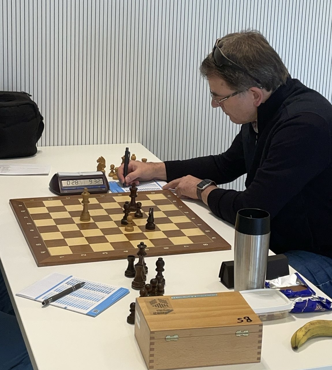 An Brett 1 kämpfte unser Paul Osterried gegen Patrick Zent. Obwohl Paul schlecht aus der Eröffnung kam und durchgängig ein verlorenes Mittelspiel auf dem Brett hatte, rettete er sich noch ins Remis.